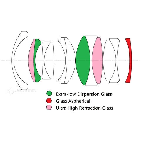 - 2 枚の超高屈折レンズと 2 枚の超低分散(ED)レンズを含む 7 群 13 枚のレンズ構成を採用しました。