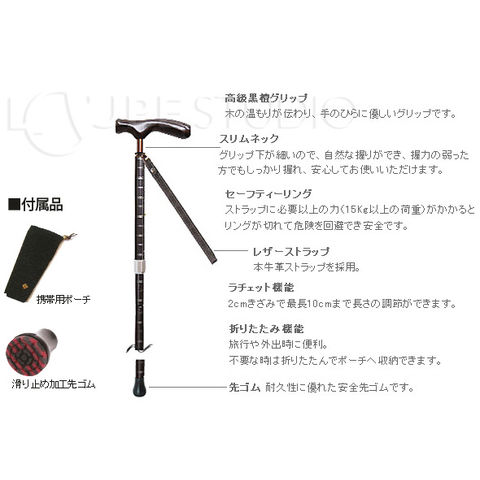 旅行に便利な携帯用ステッキです。小さく折りたたみができて、コンパクトに収納。バッグにスッポリ収まる杖です。T-1タイプはサイズ調節機能付です。確かなポール技術で60年にわたり培ってきた開発力をおしみなく注ぎ、男性向け折りたたみ杖(ステッキ)の最高峰、グランド・カイノスシリーズが誕生しました。機能性・携帯性を追求し、高級感漂う黒檀グリップや本革ストラップを採用。また先端には安全性を高める、滑りにくい先ゴムを開発し、お付けしています。本物が持つ豊かさを知るあなたに、私たちの誇りを込めてお送りする、男性用高級折りたたみ杖です。