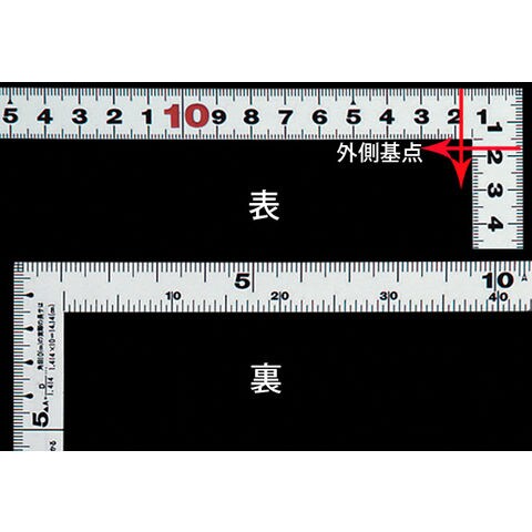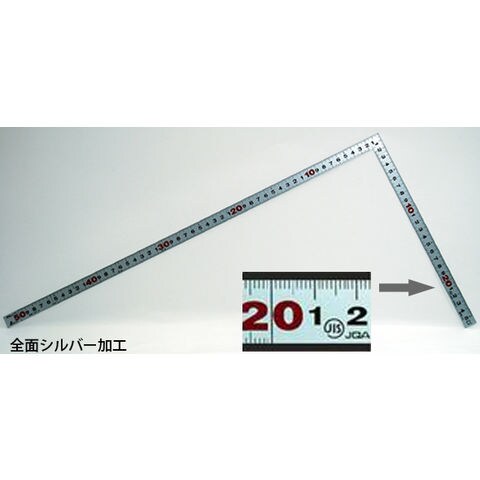| 仕様 | ■精度 ●直角度:100mmにつき、0.1mm以下 ●長さの許容差:±0.2mm以下 ■表目盛 ●長枝:外目盛50cm 内目盛45cm ●短枝:外目盛25cm 内目盛20cm ■裏目盛 ●長枝:外目盛角目 内目盛丸目、ホゾ ●短枝:外目盛25cm ■表示 ●JISマーク ●赤数字入 ■形状:同厚 |