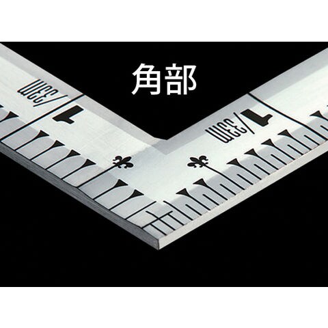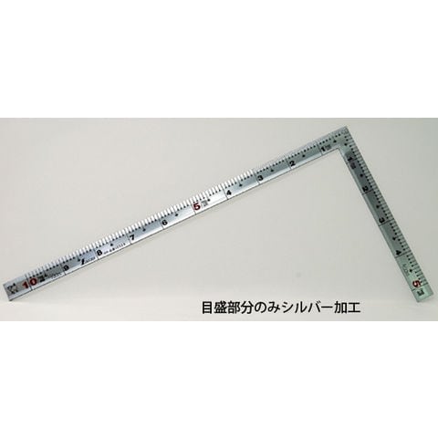 | 仕様 | ■精度 ●直角度:100mmにつき、0.1mm以下 ●長さの許容差:±0.2mm以下 ■表目盛 ●長枝:外目盛1尺 ●短枝:外目盛5寸 ■裏目盛 ●長枝:外目盛角目 ●短枝:外目盛5寸 ■表示 ●赤数字入 ■形状:同厚 |