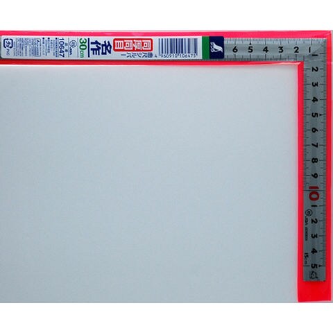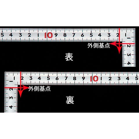 | 仕様 | ■精度 ●直角度:100mmにつき、0.1mm以下 ●長さの許容差:±0.2mm以下 ■表目盛 ●長枝:外目盛30cm 内目盛25cm ●短枝:外目盛15cm 内目盛10cm ■裏目盛 ●長枝:外目盛30cm 内目盛20cm、ホゾ ●短枝:外目盛15cm 内目盛10cm ■表示 ●JISマーク ●赤数字入 ■形状:同厚 |