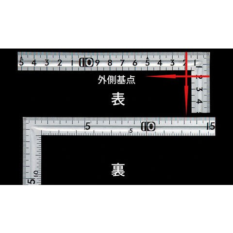 | 仕様 | ■精度 ●直角度:100mmにつき、0.1mm以下 ●長さの許容差:±0.2mm以下 ■表目盛 ●長枝:外目盛30cm 内目盛5mmピッチ30cm ●短枝:外目盛15cm 内目盛5mmピッチ15cm ■裏目盛 ●長枝:外目盛30cm 内目盛角目 ●短枝:外目盛15cm 内目盛丸目 ■形状:同厚 |