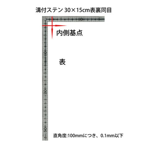 | 仕様 | ■精度 ●直角度:100mmにつき、0.1mm以下 ●長さの許容差:±0.2mm以下 ■表目盛 ●長枝:外目盛30cm 内目盛5mmピッチ30cm ●短枝:外目盛15cm 内目盛5mmピッチ15cm ■裏目盛 ●長枝:外目盛30cm 内目盛5mmピッチ30cm ●短枝:外目盛15cm 内目盛5mmピッチ15cm ■形状:同厚 |