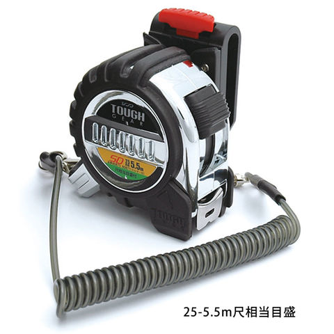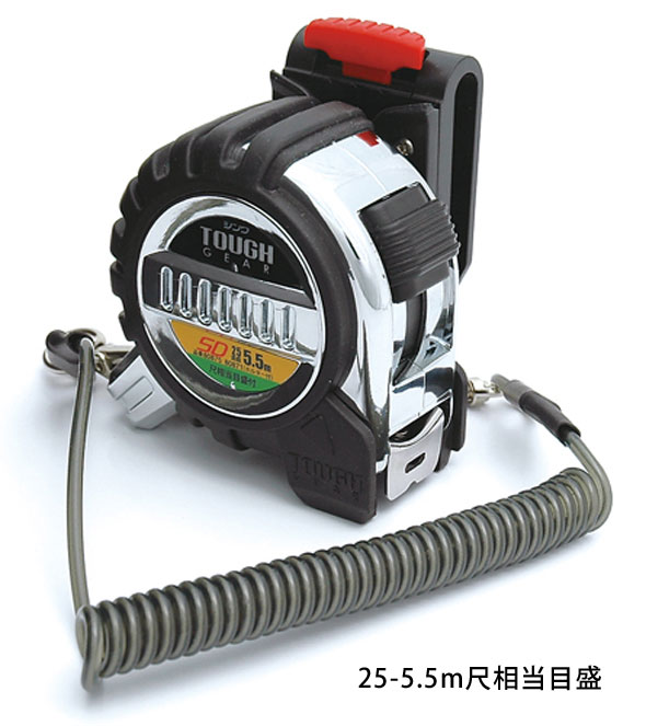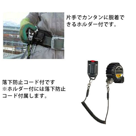 | 仕様 | ■テープ仕様 ●テープ長さ:5.5m ●テープ巾:25mm ■表:JIS1級 裏:尺相当目盛 ■ベルトホルダー付 ■落下防止コード付 |