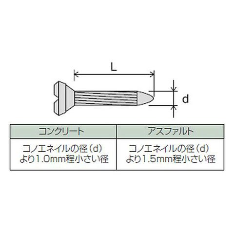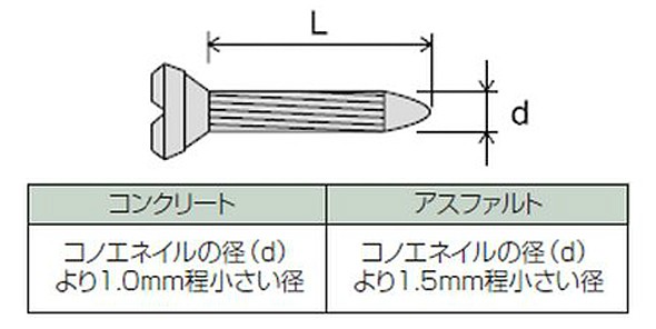 | 仕様 | ■穴径の目安 ●コンクリート:コノエネイルの径より1.0mm程小さい径 ●アスファルト:コノエネイルの径より1.5mm程小さい径 ■用途:コンクリート用 |
