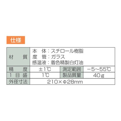 | 材質 | ■本体:スチロール樹脂 ■度管:ガラス ■感温液:着色精製白灯油 |