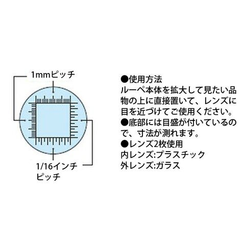 | 仕様 | ■レンズ倍率:10倍 ■レンズ径:28mm ■使用電池:単2乾電池2本(別売り) ■使用電球 ●電圧:2.5V ●電流:0.3A ■底部目盛 ●1mmピッチ ●1/16インチピッチ |