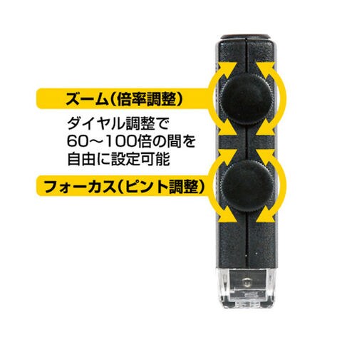 | 仕様 | ■レンズ倍率:60倍~100倍 ■光度:12900mcd ■使用電池:アルカリ電池 LR1130 3個(付属) ■使用電球:LED |