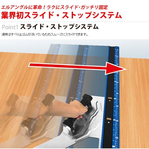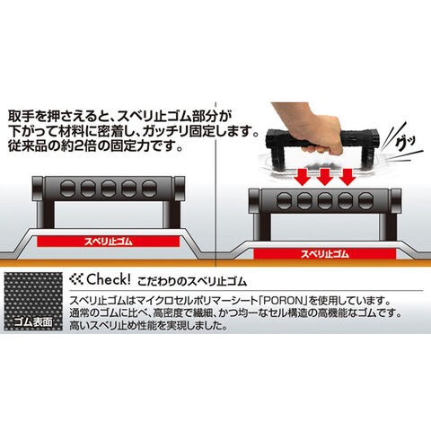 - ラクにスライド、ガッチリ固定できる、「スライド・ストップシステム」を採用しました。通常はスベリ止ゴムが浮いているためスムーズにスライドできます。取手を押さえると、スベリ止ゴム部分が下がって材料に密着し、ガッチリ固定します。