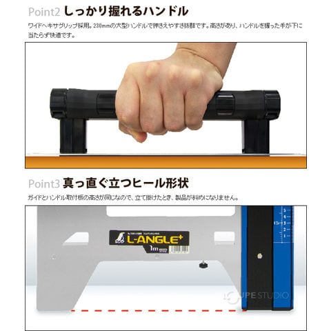 - 真っ直ぐ立つヒール形状を採用しました。ガイドとハンドル取付板の高さが同じなので、立て掛けたとき、製品が斜めになりません。