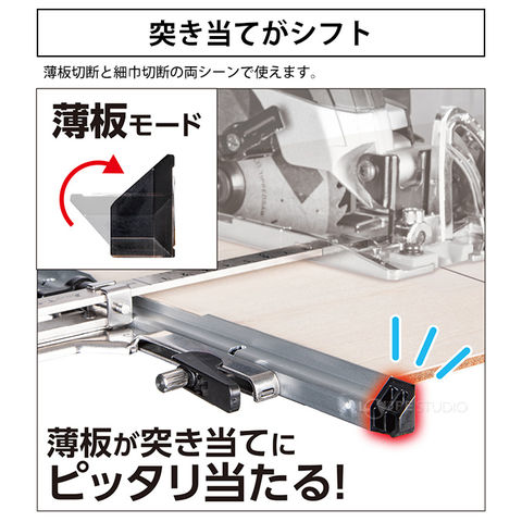 - ワンタッチで薄板と細巾切断の切り替えができます。突き当てを起こすことで薄板が入り込まずに切断できます。また、突き当てを倒すことで細巾切断が可能になります。