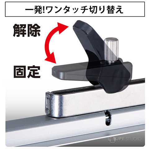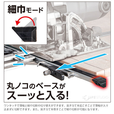 • ワンタッチで薄板と細巾切断の切り替えができます。突き当てを起こすことで薄板が入り込まずに切断できます。また、突き当てを倒すことで細巾切断が可能になります。