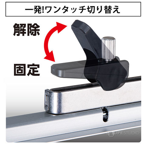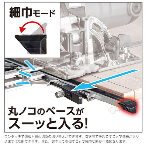 - ワンタッチで薄板と細巾切断の切り替えができます。突き当てを起こすことで薄板が入り込まずに切断できます。また、突き当てを倒すことで細巾切断が可能になります。
