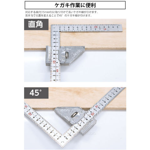- 対応する曲尺(15mm巾)に取り付けて長いケガキ線が引けます。