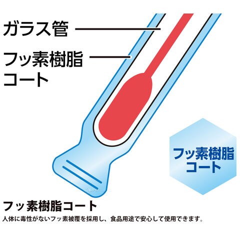 人体に毒性がないフッ素樹脂がコー ティングされているためガラス管が割れてもガラス片が飛び散らず、安心して食品に使用できます。