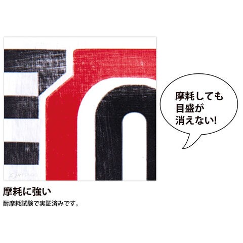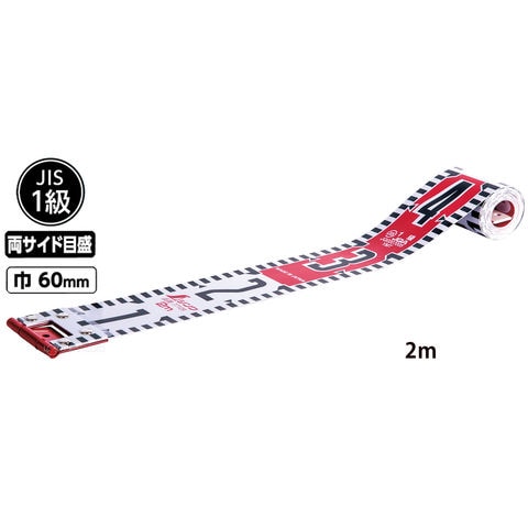 | 目盛 | 表面/タテ数字、両サイド目盛、20cm赤白、5mm単位 裏面/ヨコ数字、片サイド目盛、1m赤白、5mm単位 |