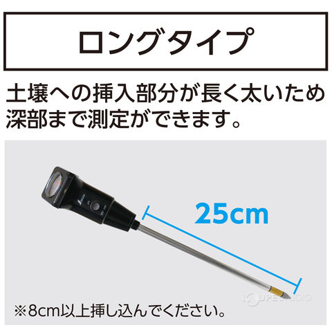 - 土壌への挿入部分が長く太いため深い部分の測定ができます。