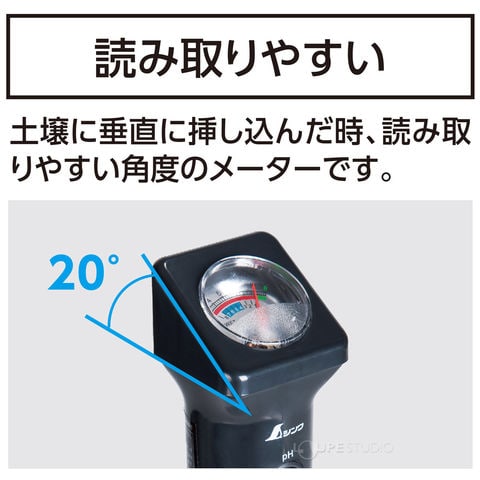 - 土壌に垂直に差し込んだとき、読み取りやすい位置にメーターがあります。