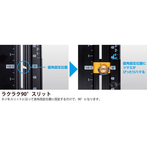 - ネジをスリットに沿って直角固定位置に固定するだけで、90°になります。
