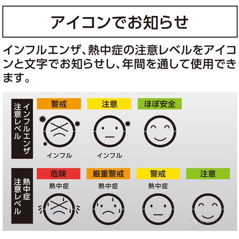 - 熱中症、インフルエンザの注意レベルをアイコンと文字でお知らせします。