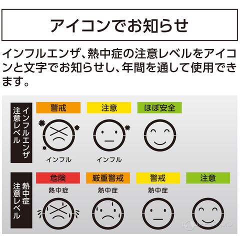 - 熱中症、インフルエンザの注意レベルをアイコンと文字でお知らせします。
