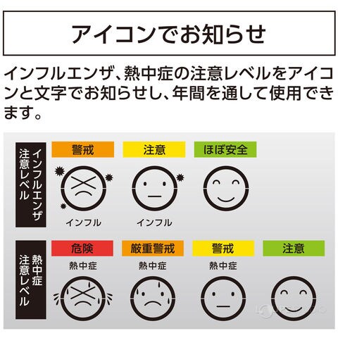 • 熱中症、インフルエンザの注意レベルをアイコンと文字でお知らせします。