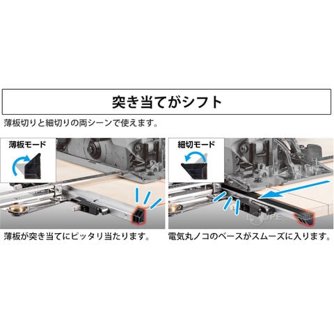 - 9mmボードを重ねた状態で切断するのに適した突き当ての高さで、2枚目の材料に干渉しません。