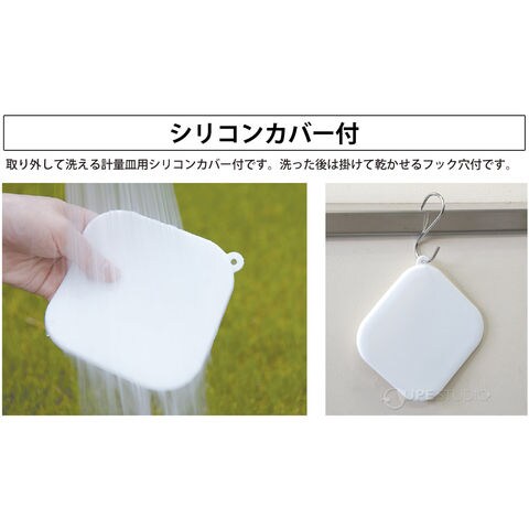 - 取り外して洗える計量皿用シリコンカバー付です。