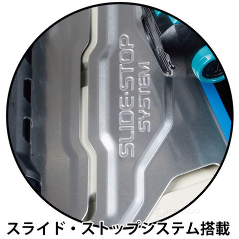 - スライド・ストップシステムを採用しました。通常はスベリ止ゴムが浮いている為、スムーズにスライドできます。取手を押さえると、スベリ止ゴム部分が下がって材料に密着し、ガッチリ固定できます。