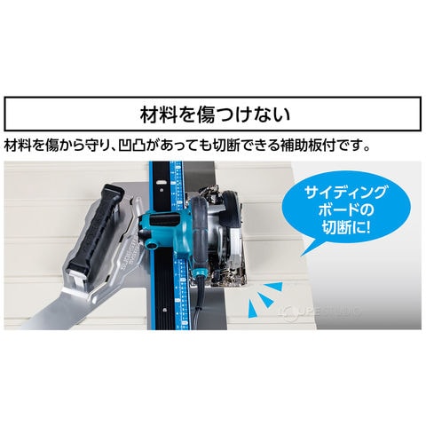 - 材料を傷から守り、凹凸があっても切断できる補助板付です。
