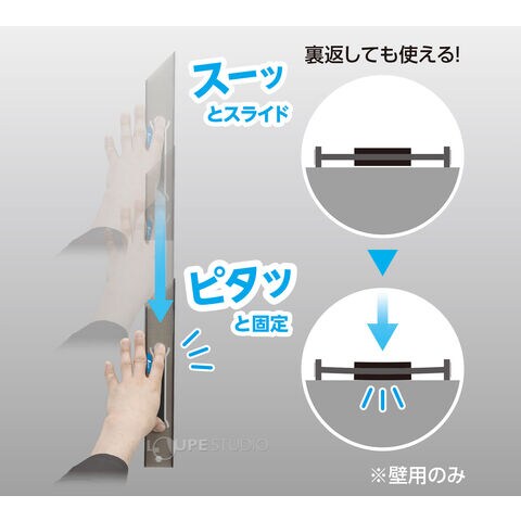 - スライド・ストップシステムを採用しました。通常はスベリ止が浮いているため、スムーズにスライドできます。穴のヘリを押さえると、スベリ止部分がクロスに密着し、ガッチリ固定できます。