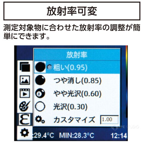 - 放射率が0.01から1まで設定できます。