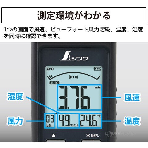 - 1つの画面で風速、ビューフォート風力階級、温度、湿度を同時に確認できます。