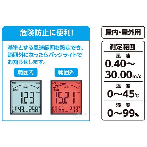 - 風速範囲を設定、範囲外の場合に赤いバックライトで知らせる機能付です。