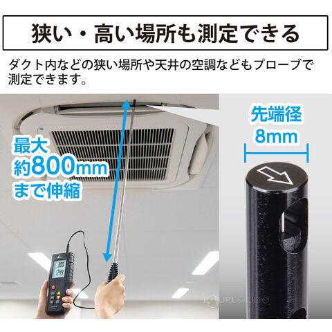 • 天井の空調設備など、手が届かない所の測定時に手元で風速を確認できる便利な伸縮式プローブです。