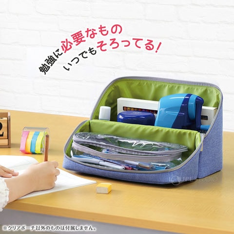 - 一般的なB5ノート対応サイズ。下敷きやノート、鉛筆削りや卓上掃除機、クリアポーチには筆記用具やはさみなどが収納可能です。
