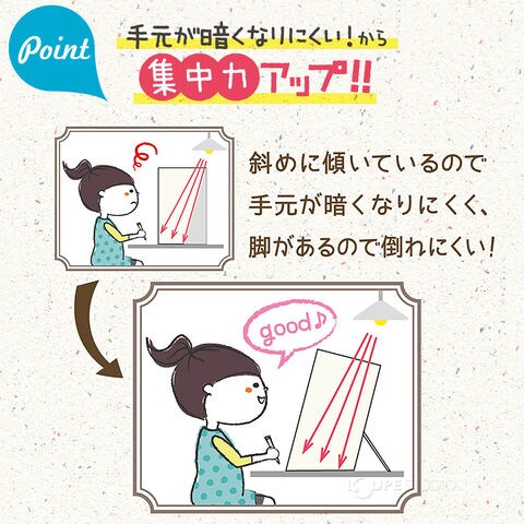 - 斜めに傾いているので手元が暗くなりにくく、脚があるので倒れにくい!