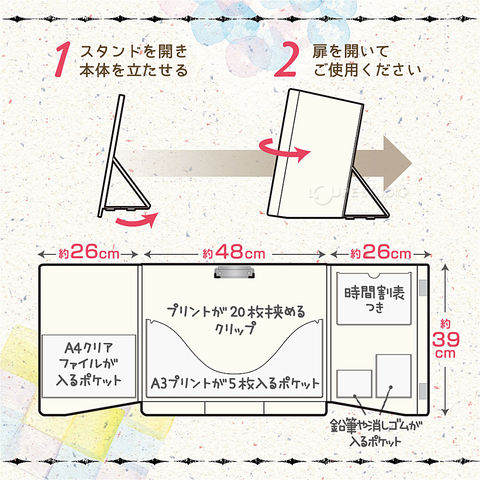 | 商品サイズ | 475×388×25mm 扉を開け寝かしたとき/995×15×388mm 使用時/765×390×355mm |
