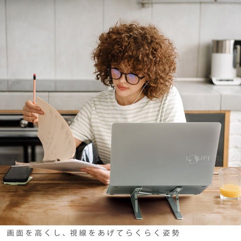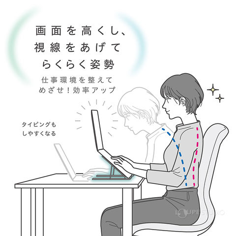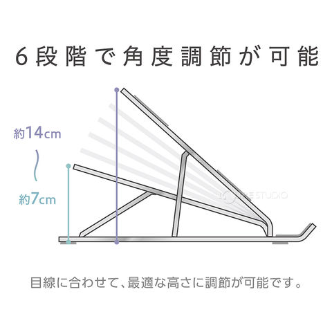 - 6段階の角度調節で、ノートパソコンの画面を目線に合わせた最適な高さに調節が可能。