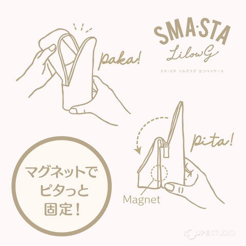 - 半円柱型のポーチをくるっと開くとマグネットでピタッと吸着、しっかり安定するスタンドタイプに早変わり。