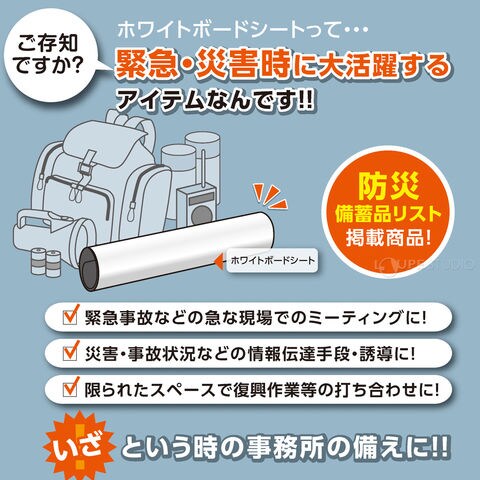 緊急事故などの急な現場でのミーティングに、災害・事故状況などの情報伝達手段・誘導に、限られたスペースで復興作業等の打ち合わせに。ホワイトボードシートは緊急・災害時必須アイテムとして防災備蓄品リストに掲載されています。