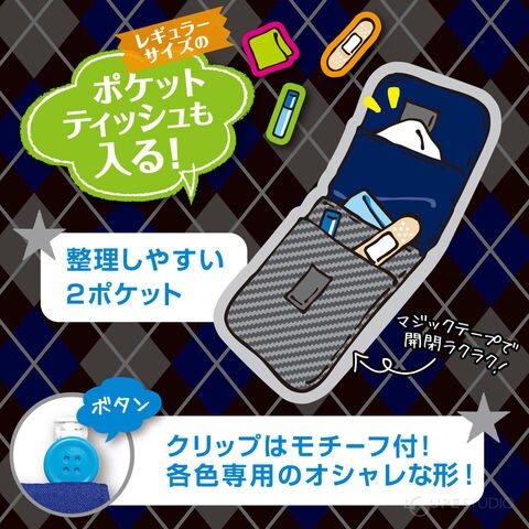| サイズ | 商品/118×163×19mm 本体のみ(クリップなし)/118×130×10mm ティッシュ入れ部内寸/110×100mm ポケット部の深さ/120mmと90mm パッケージ/187×170×19mm |