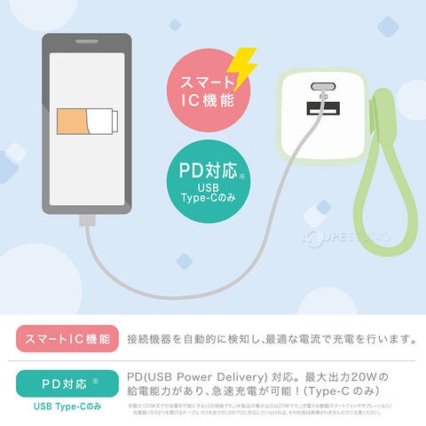 USB充電器 タイプC タイプA スマホ タブレット PC コンパクト おしゃれ 持ち運び 充電 仕事 勉強 USB-A&C ケーブルリング付 スマートIC ユートリムエル ソニック sonicスペック