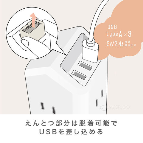 • USB Type-A 3ポート(合計 最大5V/2.4A)。シリコン製の煙突の中にUSBポートが3つあります。