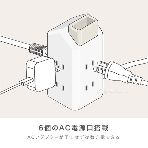• ACコンセントは6口(合計1400Wまで)。差込口は3方向に向いているので、ACアダプター同士の干渉を防ぎます。