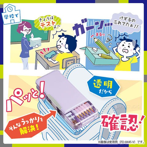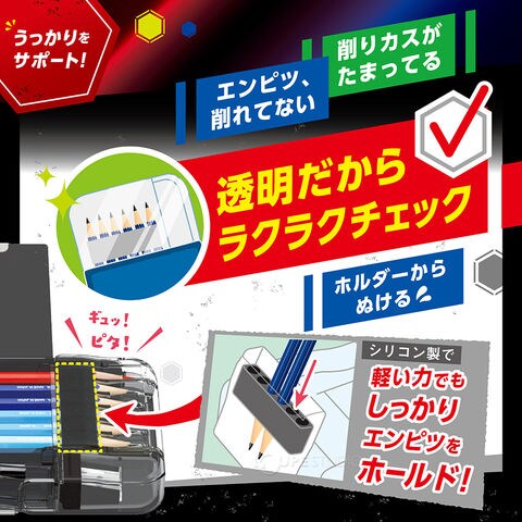 - フタを開けずに、外側から鉛筆の芯先が見える設計だから、閉じたままでも鉛筆の有無や削り忘れのチェックができる。