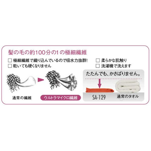 - 「ウルトラマイクロ繊維素材」(=髪の毛の約100分の1の極細繊維)により水分をよく吸い、たたんでもかさばらないのでコンパクトに運べる速乾ドライタオル。