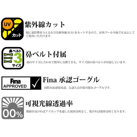- ■日本人の顔の形状に合わせた3Dクッションでフィット感を向上させ、飛び込みでのズレや水漏れのリスクを軽減させる高密着クッション付レーシングゴーグルです。