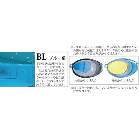 - ■カーブ形状のレンズ面になることで、流水抵抗の低減を実現。また、ゴーグル側面までレンズが広がり、より広い視界を確保します。