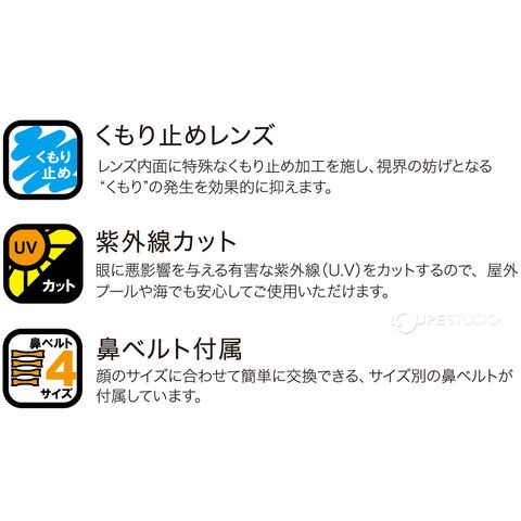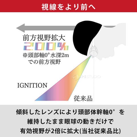※ このゴーグルは、レンズに傾斜がついているため通常のスイミングゴーグルと見え方が異なります。